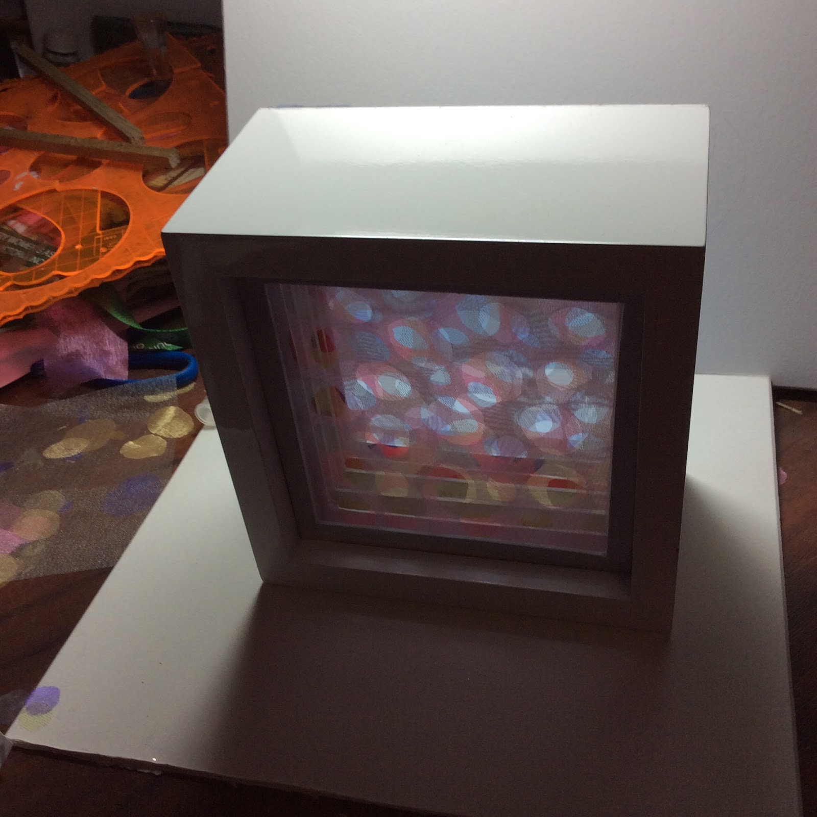 This is a box that I created using layers of organza. It is also based on the subcellular world, but this time plant cells. I was very pleased with the way light moves through it and it now sits on my desk near the window to catch the light.
